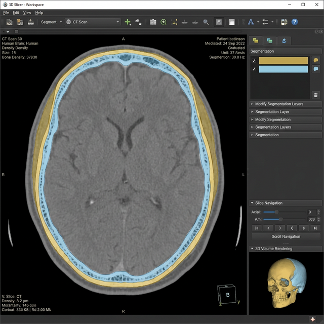 Understanding variations in skull thickness, particularly resolving the complex diploe internal spongy bone layer, requires delicate segmentation. This project aimed to create a fully computational thickness map over the entire skull using programmatic control within Slicer, allowing high-throughput calculations across patient cohorts.